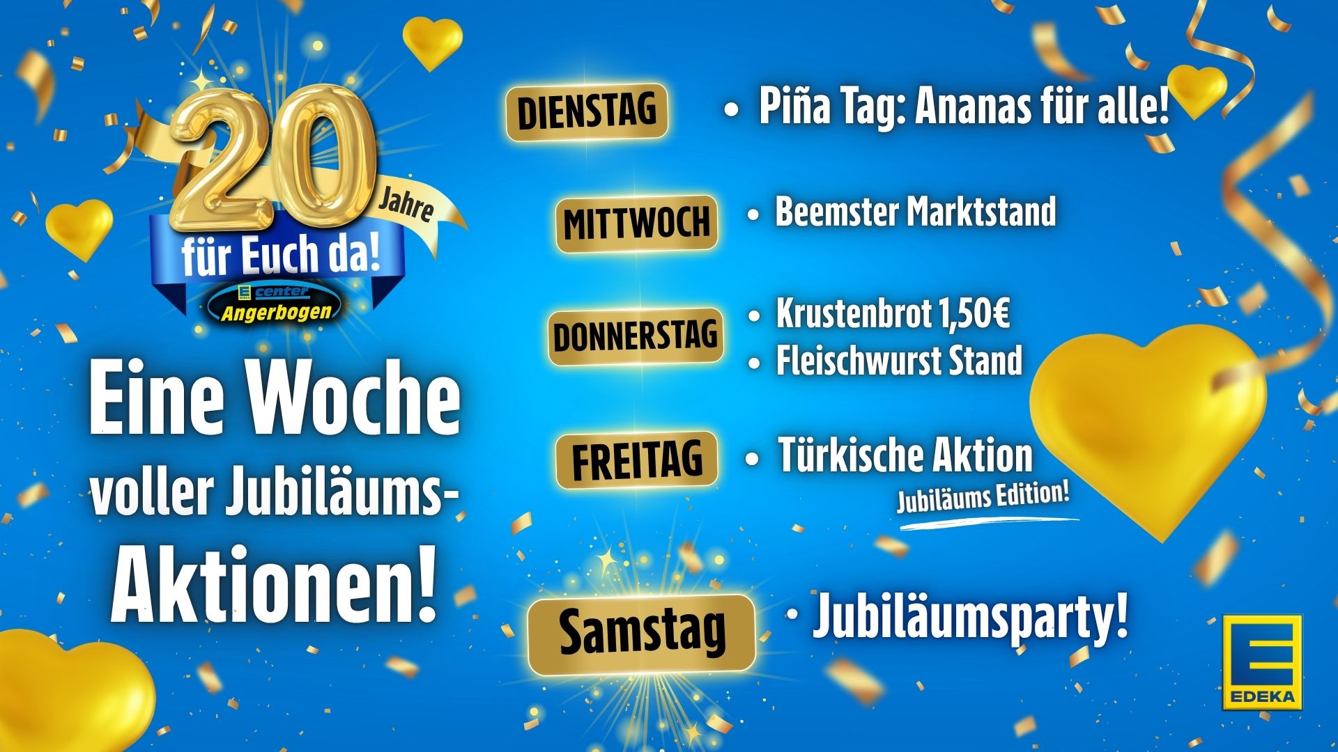 Dieses Jahr wird das E-Center Angerbogen 20 Jahre jung – und das möchten wir mit Ihnen gebührend feiern! Freuen Sie sich auf eine ganze Woche voller Aktionen, Angebote und besonderer Events, die wir für unsere treuen Kundinnen vorbereitet haben.